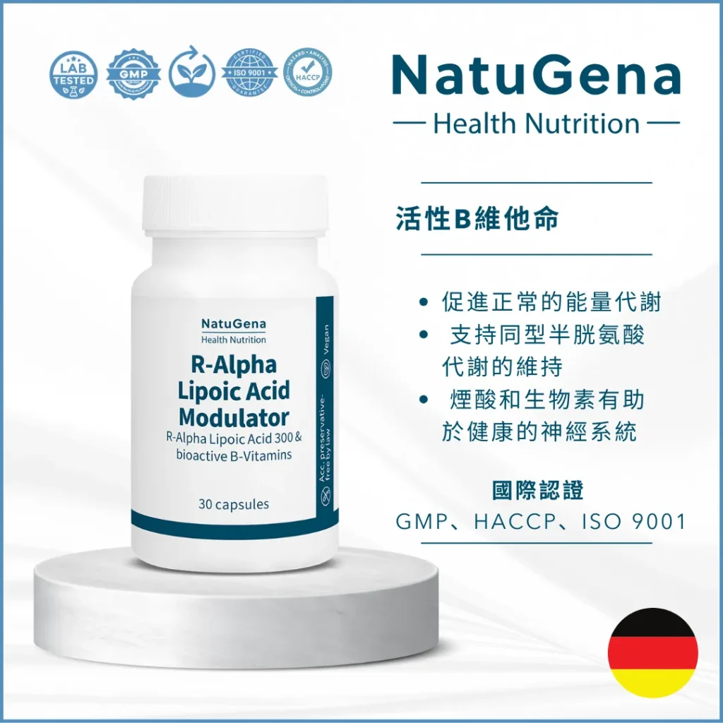 具有生物活性 (+) 形式的 R-α 硫辛酸及其輔助因子 B 群維生素,可促進正常的能量代謝